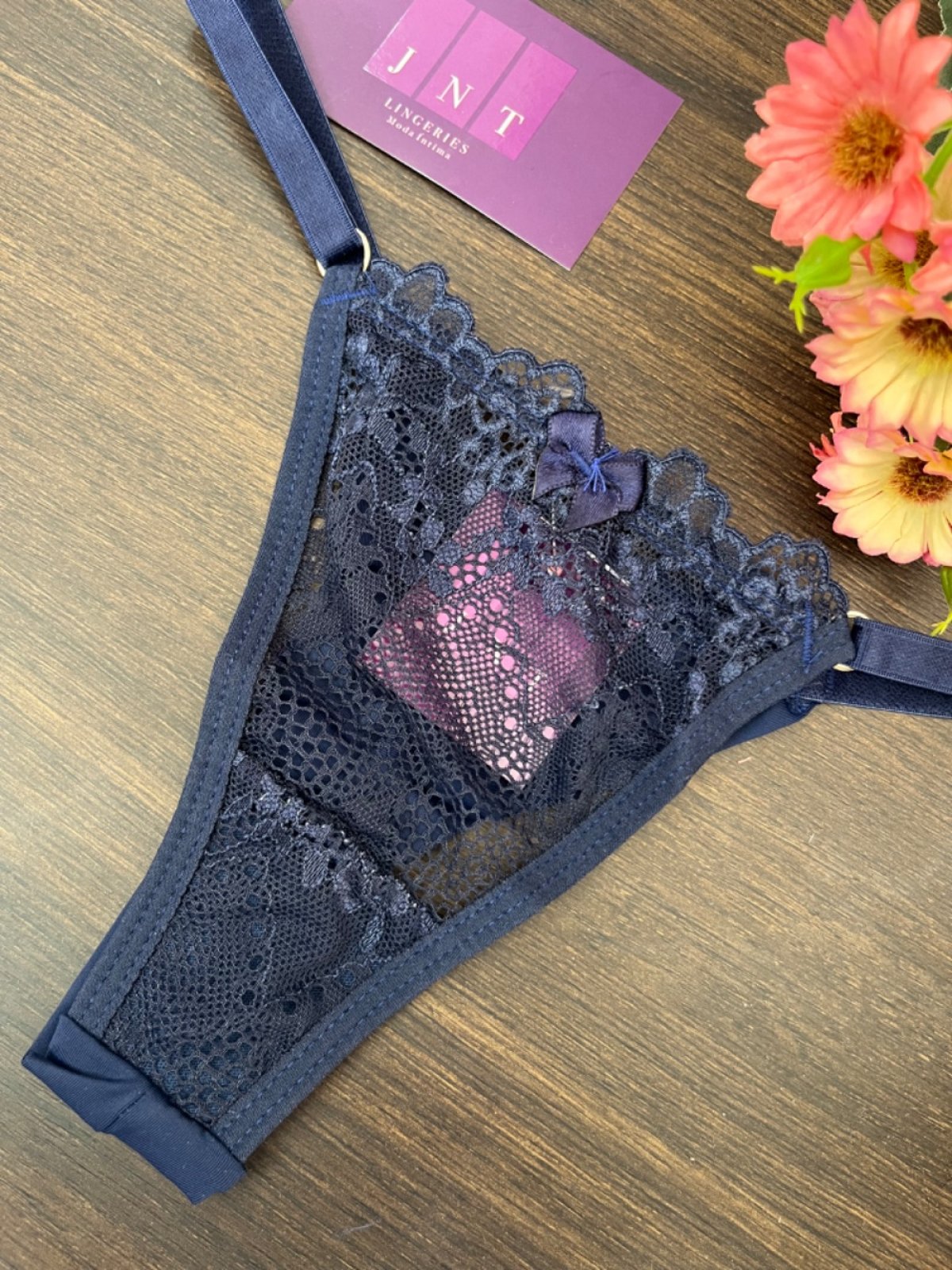 Calcinha String Renda e fio duplo com laterais reguláveis em elástico macio e detalhe de laço na parte frontal. Possui forro em algodão.