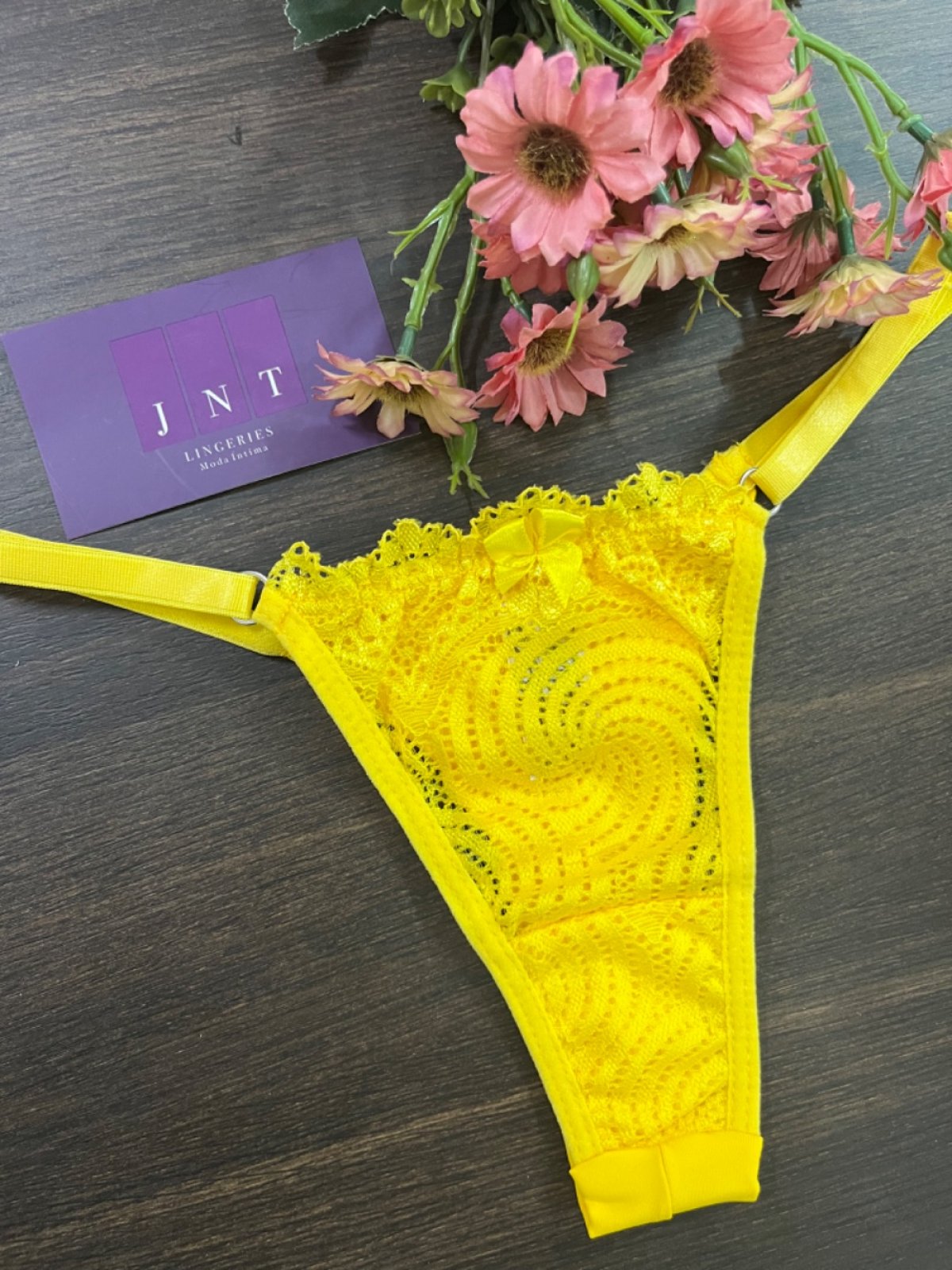 Calcinha String Renda e fio duplo com laterais reguláveis em elástico macio e detalhe de laço na parte frontal. Possui forro em algodão.