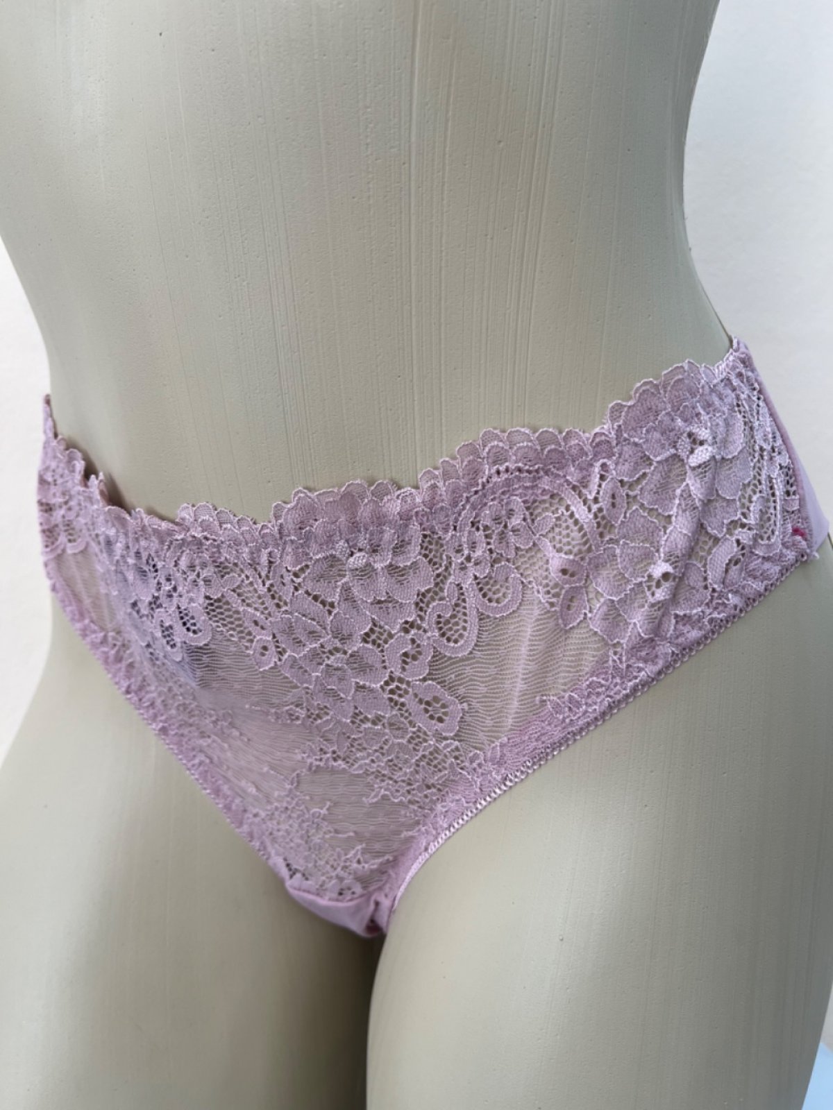 Calcinha Lady confeccionada em renda com bordado floral e leve transparência na frente. com fio duplo na parte de trás com laterias médias e forro de algodão